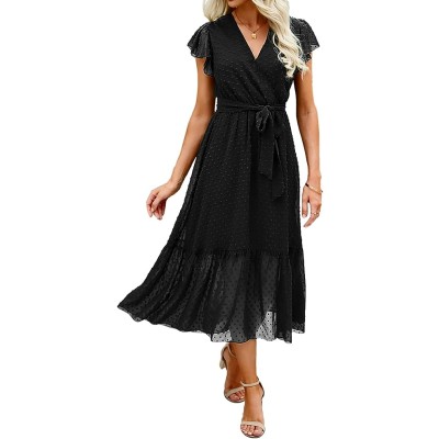 Floerns Women's V Back Inslace Layered Ruffle Hem Flutter Sleeve Dress