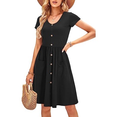 OUGES Women's V Neck Button Down Skater Dress with Pockets