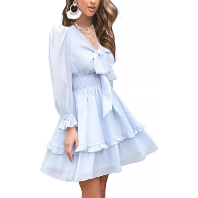 EXLURA Women Tie Front Elastic Waist Tiered Ruffle Layer Floral Balloon Long Sleeve V-Neck A-Line Mini Dress