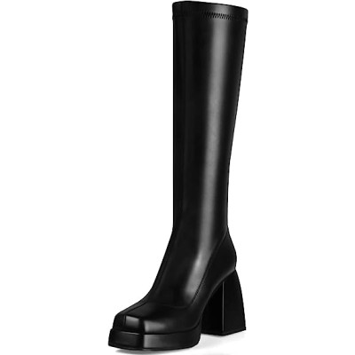 wetkiss Stacked Platform Knee High Boots for Women, Chunky High Heeled Go-Go Boots Square Toe Side Zip Stretch Boot